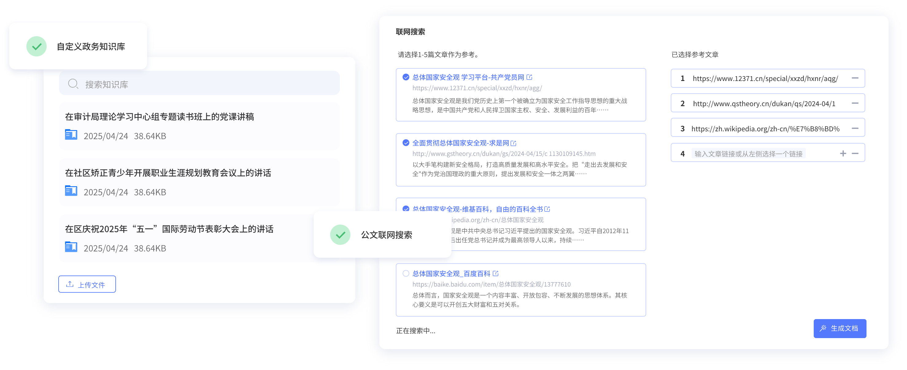 上傳政務(wù)或個人寫作常用材料,用于精準(zhǔn)生成符合自己寫作風(fēng)格的公文